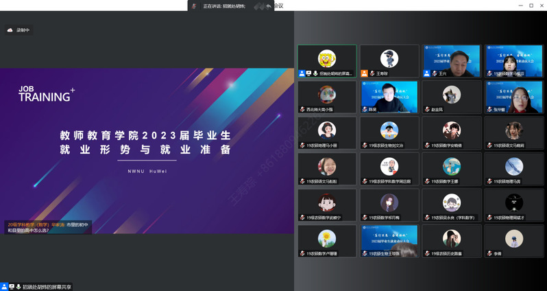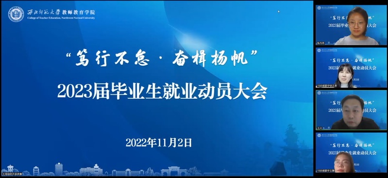 引导毕业生认清就业形势,有效提升就业能力,准确把握就业机会,全面促进2023届毕业生高质量充分就业,根据公司的整体安排和部署,教师教育公司11月2日晚19:30 ,通过腾讯会议召开了2023届毕业生就业动员大会,公司人才招聘处胡炜老师,公司领导班子成员,辅导员,毕业生班主任、导师以及全体2023级硕博毕业生共计170余人参加了会议,动员大会由公司党委书记王兴主持。