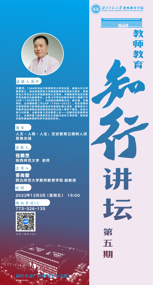 任鹏杰,1984年毕业于陕西师范大学历史系,香港公开大学教育硕士。现任陕西师范大学基础教育研究院执行经理、陕西师范大学历史文化公司教育硕士生导师、中国教育学会历史教学专业委员会副理事长。从事《中学历史教学参考》编辑工作30年(1992年至今),先后担任编辑部主任、副主编、主编等职,主持编辑部工作26年(1996—2022)。先后受聘担任教育部高中新课程远程培训专家团队核心成员、教育部中小学教师培训课程标准研制项目协同主持人等多个兼职。发表文章100多篇,出版专著《历史•教育•人生——任鹏杰历史教育杂文》,主编专著《教育研究论文选题与写作》等多部,策划组织服务基础教育研究学术活动百余场。