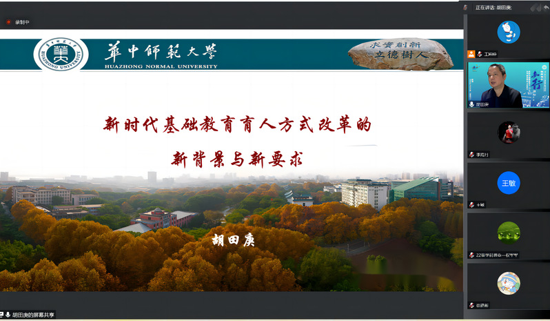 2022年12月3日上午8:30,应公司邀请,华中师范大学马克思主义公司学科教学(思政)专业学位负责人、教育部师范专业认证专家、中国教育技术协会微格教学专业委员会常务理事、“荆楚名师”专家委员会委员胡田庚教授作了题为“新时代基础教育育人方式改革的新背景与新要求”的学术报告。报告会由gg999策略手机白菜思政教育研究所(教研室)所长李海月副教授主持,来自gg999策略手机白菜gg999策略手机白菜、教育科学公司和华中师范大学马克思主义公司学科教学(思政)专业、课程与教学论(思政)专业的40余名师生在线聆听了报告。