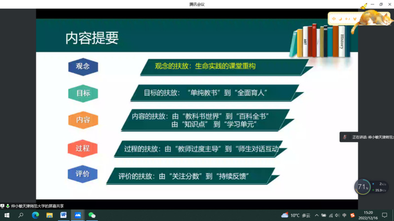 最后,仲老师从“观念的放扶:生命实践的课堂重构”“目标的放扶:单纯教书到全面育人”“内容的放扶:由知识点到学习单元”“过程的放扶:教师过度指导到师生对话互动”“评价的放扶:关注分数到持续反馈”等五个方面深入阐释了核心素养下地理课堂的“放”与“扶”;并就深度学习,学习单元,具身认知展开讲解,重点对学习情境展开论述。