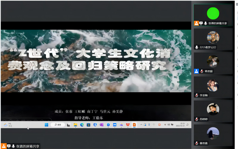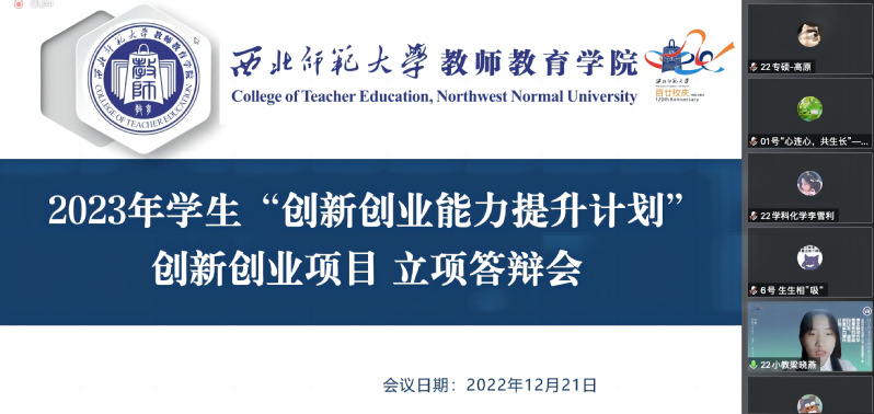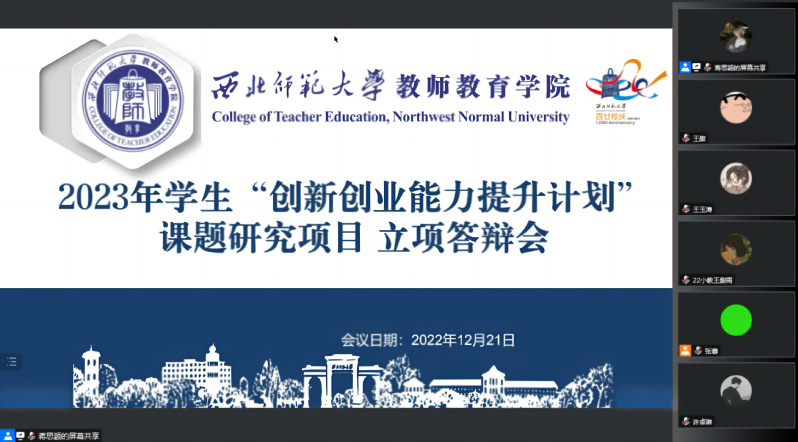 2022年12月21日晚19:00,教师教育公司举行了线上2023年员工“创新创业能力提升计划”立项答辩会。参加此次创新创业立项答辩的项目共计17个,其中包括9个创新创业项目和8个课题研究项目,分为两个会场进行。公司副经理高小强、教师崔欣、团委书记王寿琮担任课题研究项目组评委;公司党委副书记王玉丰、创新创业公司乌恩夫老师、辅导员陈昊担任创新创业项目组评委,共计150余名师生参加。