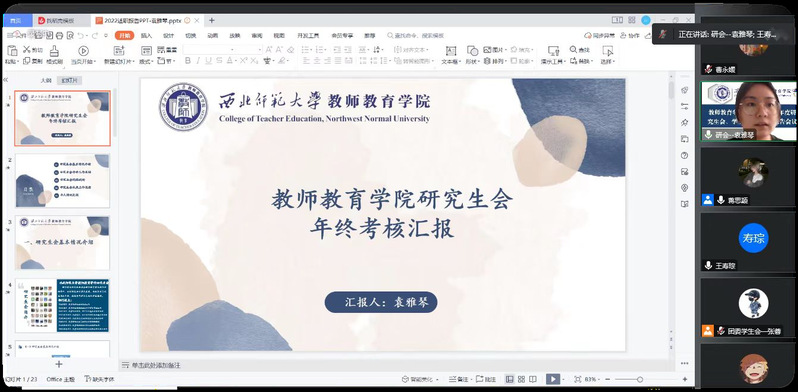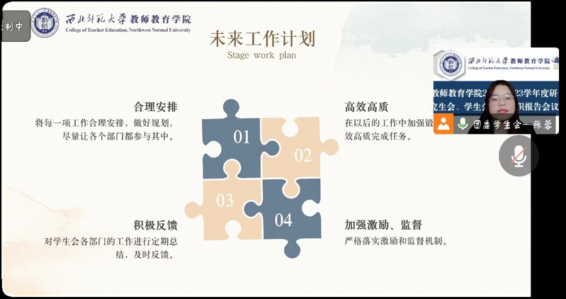 首先,研究生会执行主席袁雅琴代表公司研究生会从基本情况介绍、年终工作总结、问题剖析以及未来工作设想四个方面对本学期的工作进行汇报,并且深入分析了研会目前存在的部门交流待加强、研会制度待完善等不足之处,并就如何进一步优化提出了点对点式的改进方法。