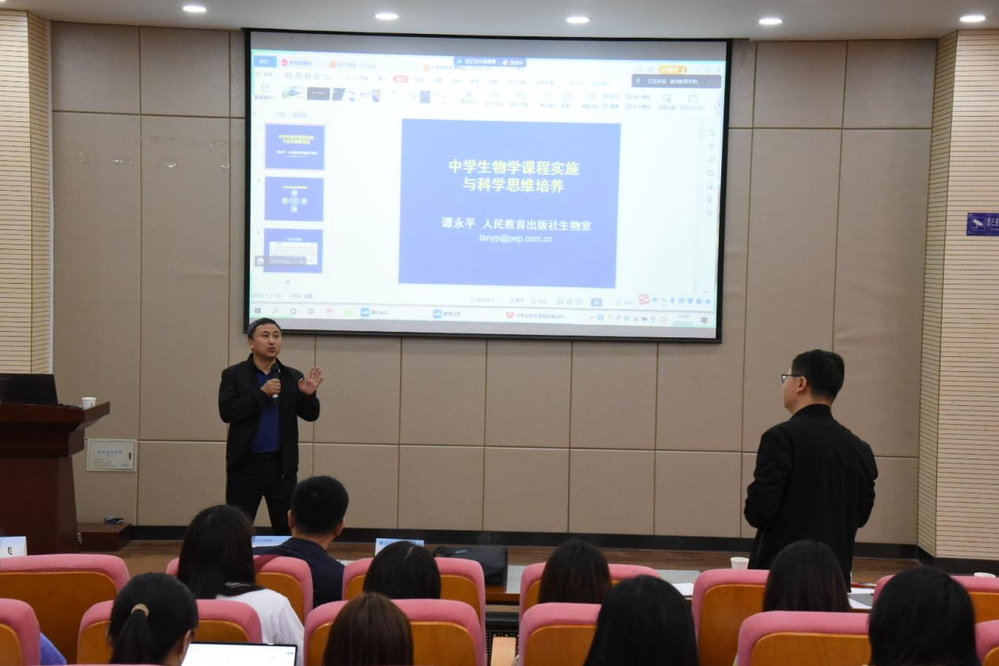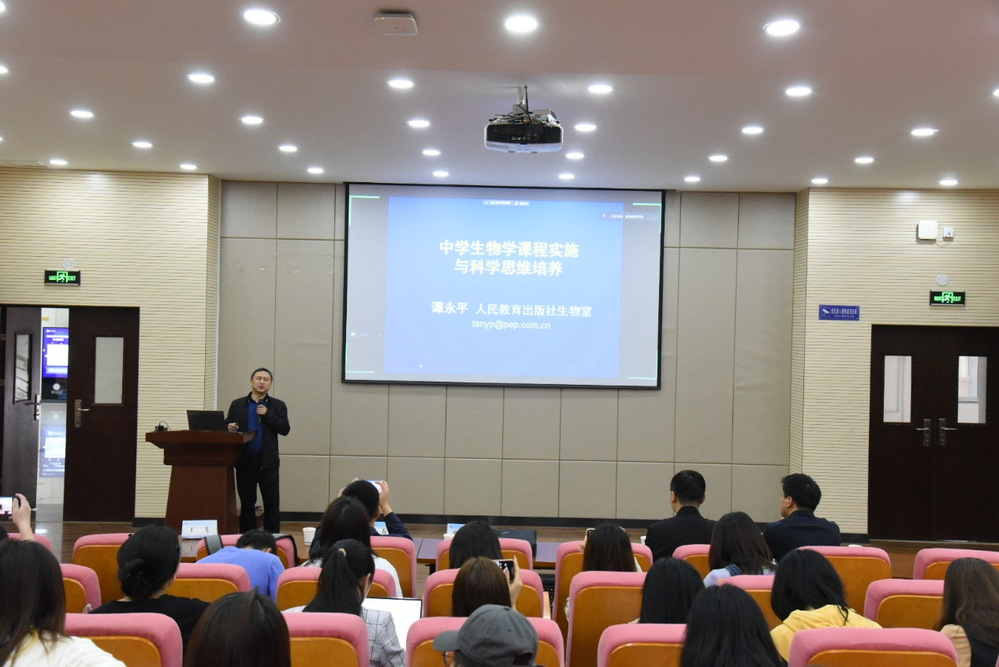 2023年6月7日上午9时,应公司邀请,人民教育出版社生物室主任谭永平老师,在弘文楼159报告厅为公司师生作了题为《中员工物学课程实施与科学思维培养》的学术报告,本次报告线上线下同步进行。报告由gg999策略手机白菜王飞副教授主持,共有来自gg999策略手机白菜、教育科学公司、生命科学公司100余位师生现场聆听了本次报告。