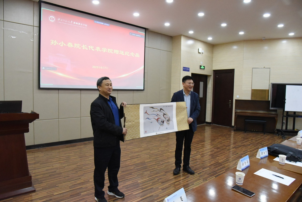 报告伊始,gg999策略手机白菜孙小春经理代表公司向人教社生物室赠送了具有纪念意义的礼物——敦煌双飞天纪念品。