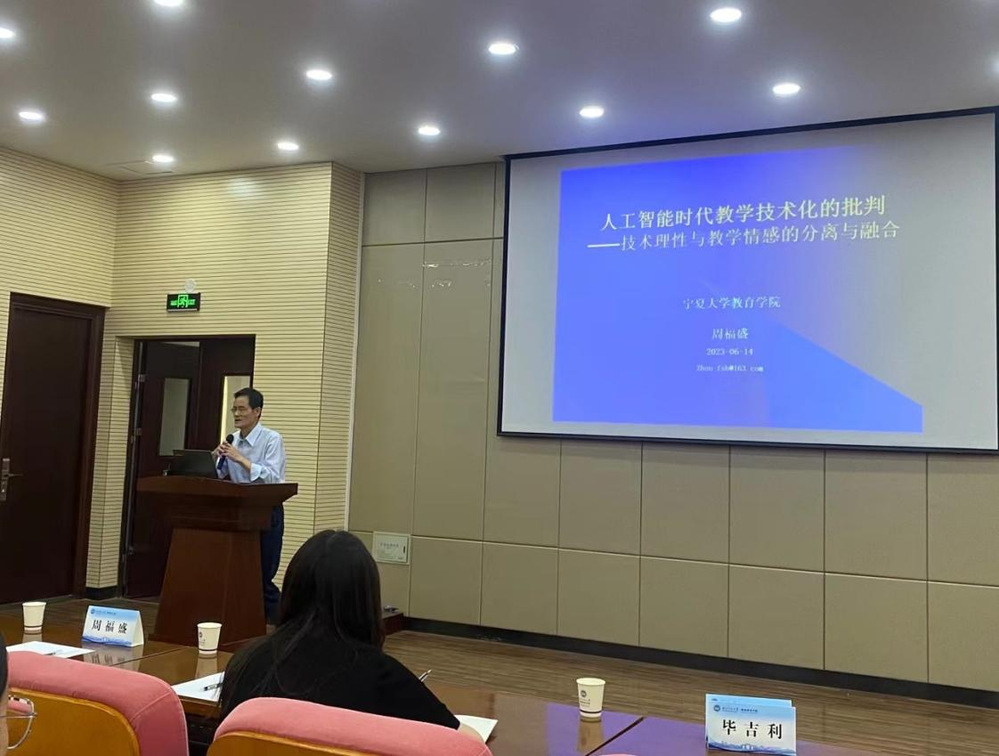 2023年6月14日,应公司邀请,宁夏大学周福盛教授为公司师生作了题为《人工智能时代教学中的情理隐忧及其化解》的学术报告。报告由毕吉利教授主持,来自教师教育学院的百余位师生参加了本次报告会。