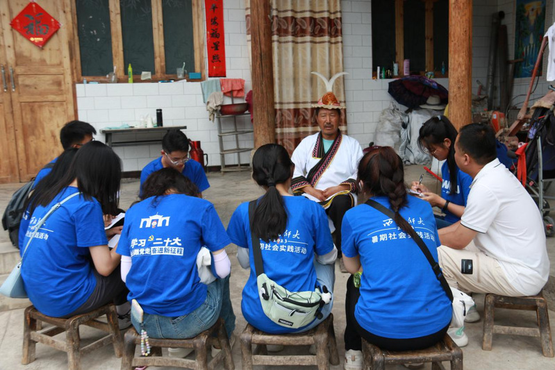 下午,实践团移至铁楼乡强曲村国家级非遗传承人余林机家中,与非遗传承人对话,深入了解学习民间最真实的文化。在访谈中队员们了解到余老师从小在长辈的耳濡目染下学习白马藏族民俗文化,将这个技艺传承了下来,并积极实践将其融入到当地的文化生活中,对白马人的故事、舞蹈、歌曲、语言、宗教信仰、民俗传承方面做出了突出贡献。他说:“在当前大力弘扬非遗文化的背景下,白马藏族文化的发展也取得长足进步,特别是在政府与社会各团体的大力支持下,白马藏族文化有了更多平台去展示与交流。”同时,目前就白马藏族民俗文化的传承方面,余老师仍存在一定的担忧,他表示,保存困难、产业化困难、传承困难是摆在白马藏族民俗文化传承前的三道难题,希望民间风俗文化的发展能够受到更进一步的重视,结合当下时代特色调整整体产业结构和布局,采取多项创新手段提高白马藏族文化的经济效益,从而吸引更多年轻人投身于非遗传承活动中来,白马藏族文化的传承与发展将迈上更高的台阶。