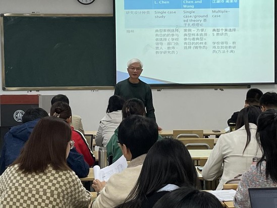 在为期三周18学时的教学过程中,吴浩明教授以独特授课视角,深入浅出地讲解了质性研究方法导论、质性研究方法分类、质性研究问题设计及研究中资料收集和分析方法等问题,在互动中巧妙地将理论知识与教育博士丰富的教育实践相结合,基于大量的案例使抽象的研究方法变得生动具体。在教学互动中,吴教授还分享了他丰富的研究经验和独到的学术见解,引导教育博士深入思考自己的研究方向和问题,并鼓励他们勇于打破已有观念的桎梏,积极探索逻辑自洽的研究问题,建构有效的研究方法。