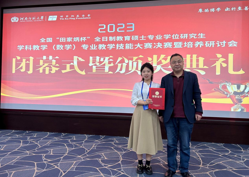 20231027-30日,2023年全国“田家炳杯”全日制教育硕士专业学位研究生学科教学(数学)教学技能大赛决赛在河南师范大学顺利举行。大赛吸引了来自全国104所高校的472名选手报名参赛。过初赛评审,最终来自97所高校的236名选手进入决赛。经过严格且激烈的决赛,公司李保臻老师、焦彩珍老师指导的gg999策略手机白菜2022学科教学(数学)专业硕士研究生王嘉仪获得三等奖。