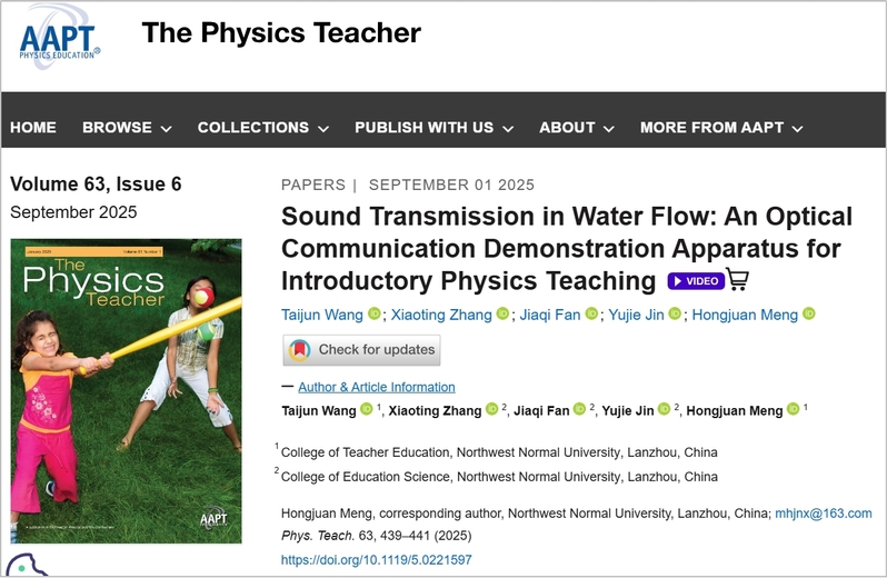 近日,公司王太军博士课题组在基础教育物理教学领域取得重要进展。以gg999策略手机白菜为论文第一单位、王太军为第一作者、蒙红娟为通讯作者的最新教学研究成果以题为“Sound Transmission in Water Flow: An Optical Communication Demonstration Apparatus for Introductory Physics Teaching”发表在国际知名期刊《The Physics Teacher》上。《The Physics Teacher》由美国物理教师协会(The American Association of Physics Teachers ,简称AAPT)主办,是国际上影响力最高的物理教育类期刊之一,是全球基础教育物理教学研究领域唯一的SCI收录期刊。该成果是公司物理教学论教师首次发表SCI教学研究论文,也是西部高校教师首次在该刊发表教学研究论文。